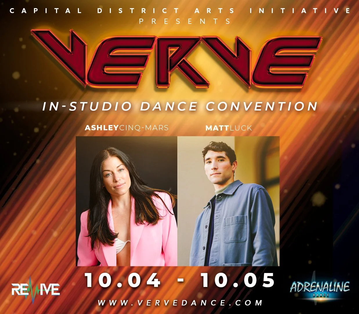 We’re excited to bring Verve In-Studio Conventions to Capital District Arts Initiative for two days of world-class training. Dancers will take master classes with industry-leading guest teachers, Ashley Cinq-Mars & Matt Luck, experiencing the energy, intensity, and inspiration of a traditional dance convention — all without the travel. Over the course of the weekend, dancers will push their technique, explore new styles, and gain fresh perspective from nationally recognized educators. To top it off, scholarships will be awarded at the end of the event, giving dancers the chance to be recognized for their hard work and talent.